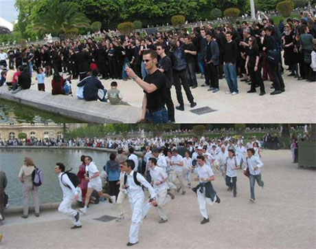 En una de las últimas veces en París, se dio cita a los participantes en un parque céntrico de la ciudad por medio de una lista de difusión mail. La mitad de los inscritos en dicha lista fueron invitados a presentarse vestidos totalmente de blanco y la otra mitad de negro. Una vez allí, fueron informados en qué iba a consistir la acción por medio de un pequeño papel distribuido a cada uno de los participantes: situados, blancos y negros, a ambos lados de una gran fuente, el juego consistía en que cada uno de los blancos debía atrapar un negro y viceversa pero, en cambio, ninguno de ellos conocía la intención del otro grupo. El resultado visual del evento proporcionó una divertida imagen de gente de todas las edades corriendo alrededor de la fuente en el mismo sentido e intentando atraparse los unos a los otros en medio del bullicio general.